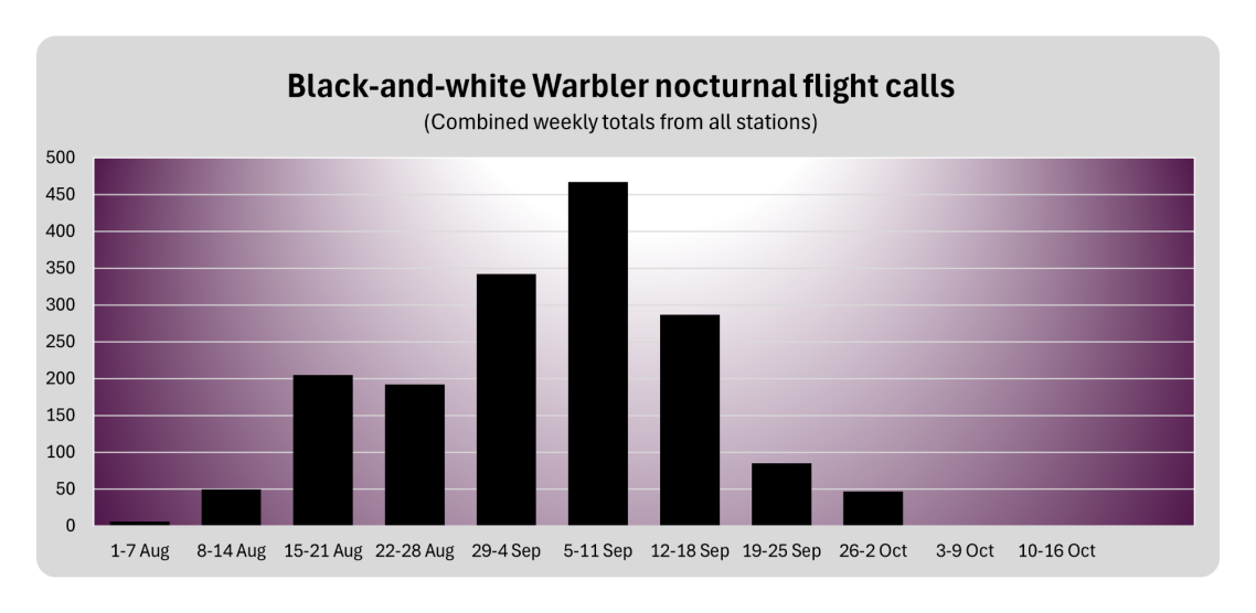 Weekly Black-and-white Warbler night flight call (nfc) activity from all five stations in the Summer 2025 WNY acoustic monitoring transect. BAWW calls were automatically detected by Nighthawk 0.3.1 software operating from half an hour after sunset to 60 minutes before sunrise. W. Evans confirmed identity of the automatic detections and removed non-BAWW calls. BAWW nfc activity is the sum of all incidences of a correctly ID'd BAWW call that occurred at least one minute from another BAWW call.