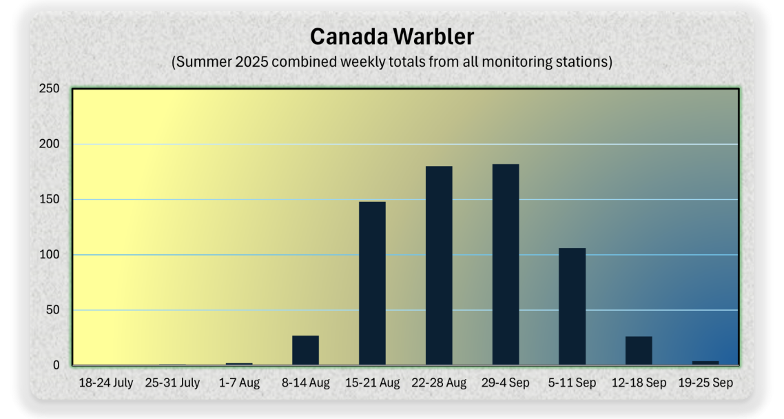 Weekly Canada Warbler night flight call (nfc) activity from all five stations in the Summer 2025 WNY acoustic monitoring transect. CAWA calls were automatically detected by Nighthawk 0.3.1 software operating from half an hour after sunset to 60 minutes before sunrise. W. Evans confirmed identity of the automatic detections and removed non-CAWA detections. Nfc activity is the sum of all incidences of a correctly ID'd CAWA call that occurred at least one minute from another CAWA call