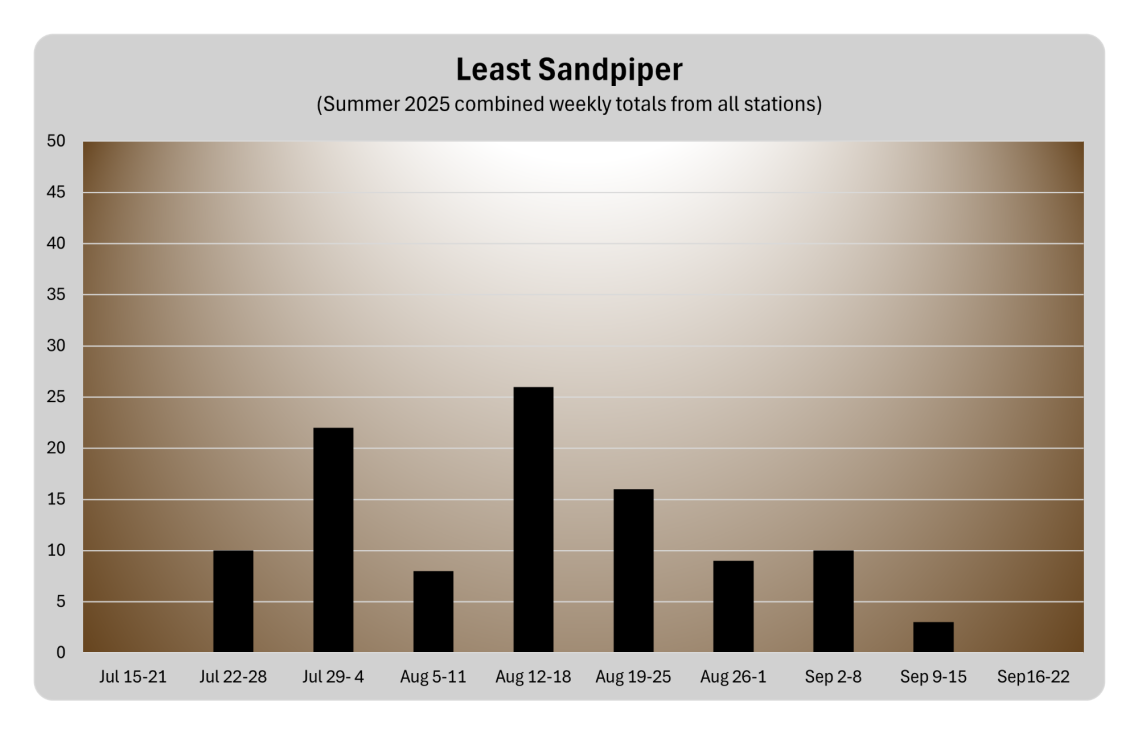 Weekly Least Sandpiper (LESA) night flight call (nfc) activity from all five stations in the Summer 2025 WNY acoustic monitoring transect. LESA calls were automatically detected by Nighthawk 0.3.1 software operating from half an hour after sunset to 60 minutes before sunrise. W. Evans confirmed identity of the automatic detections and removed non-LESA calls. Nfc activity is the sum of all incidences of a correctly ID'd LESA nfc detection that occurred at least two minutes from another LESA nfc detection. Data in this graph is updated weekly through the end of Summer 2025.