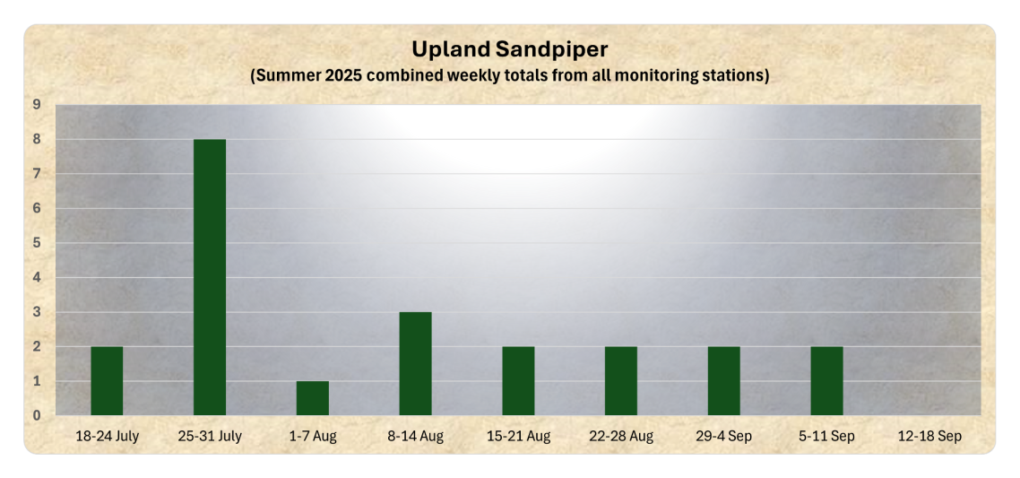 Weekly Upland Sandpiper night flight call (nfc) activity detected from all five stations in the WNY acoustic monitoring transect. UPSA calls were automatically detected by Nighthawk 0.3.1 software operating from half-an-hour after sunset to 60 minutes before sunrise. W. Evans confirmed identity of the automatic detections and removed non-UPSA calls. UPSA nfc activity is the sum of all incidences of a correctly ID'd UPSA call that occurred at least two minutes from another UPSA call. Data in this graph is updated weekly through the end of Summer 2025.